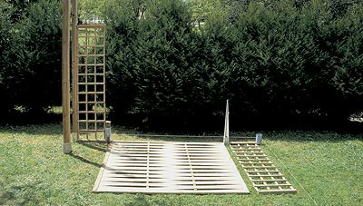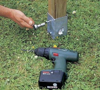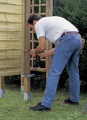 * 12 стоек (2400 × 70 × 70 мм) устанавливаются группами по 4 на концах и в углу буквы "L". В основании каждого комплекта собирается ящик для цветов. Каждая стойка имеет на вершине паз, в соответствии с расположением в конструкции, - горизонтальный или под углом 90°. Стойки вставляются в основания из оцинкованной стали, укрепленные в плиточном покрытии, бетонированной площадке или (как в нашем случае) просто забитые в землю. В каждом основании просверлены с противоположных сторон по два отверстия для крепления стоек шурупами 8 × 50 мм.
