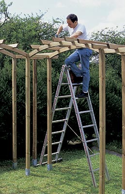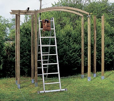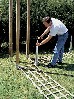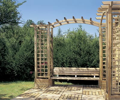 Наше сооружение, купленное в разобранном виде, имеет форму буквы "L". Комплект состоит из различных элементов: стоек, арок, перемычек, решеток, щитов и т. д. Изготовленные из сосны и обработанные в автоклаве, эти детали не сгниют и не будут повреждены насекомыми по меньшей мере десять лет.