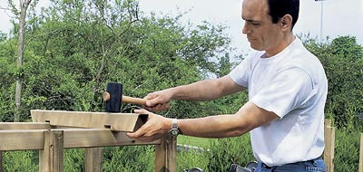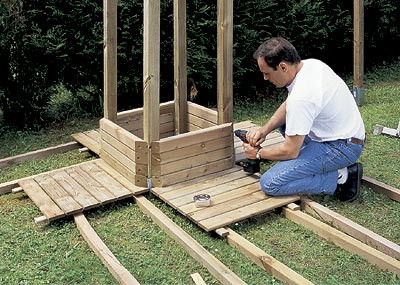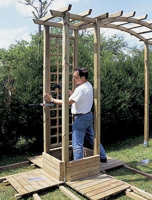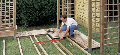 Пол перголы собирают из дощатых щитов (600 × 600 × 40 мм), укладывая их в шахматном порядке на брусья квадратного сечения (70 × 70 мм). Для выравнивания брусьев по горизонтали запаситесь несколькими короткими деревянными брусками различной высоты, так как садовая лужайка редко бывает достаточно ровной. Соединение щитов "в шип" обеспечивает простое и прочное крепление пола.