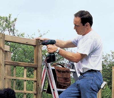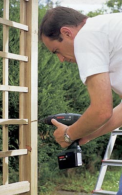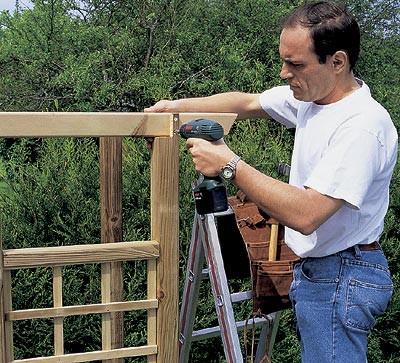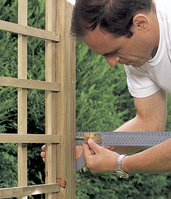 Крайние перемычки крепятся двумя шурупами 3 × 50 мм к каждой стойке и поддерживаются в вертикальном положении уголками. Расстояние между стойками определите по ширине решетки, поддерживаемой ассистентом.