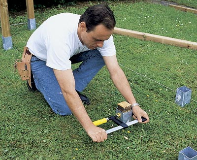 Первое основание устанавливают с помощью кувалды и обрезка стойки. Дважды проверьте вертикальность двух смежных граней каждого основания, забив его сначала на одну треть, а затем наполовину. При необходимости произведите корректировку и вбейте основание до конца. Затем натяните шнур для установки следующих оснований под прямыми углами. Для разметки расстояний между ними используйте решетку и щит, задав тем самым нужную ширину (450 и 1800 мм соответственно).