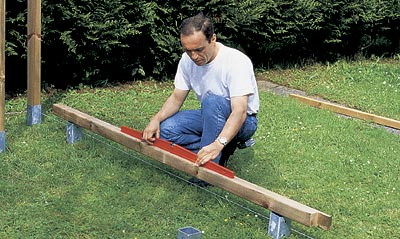 Проверьте горизонтальность плоскости, образованной основаниями, уровнем, подложив под него стойку. Если одно из них вбито глубже, чем другие, насыпьте немного щебня внутрь основания. Это приподнимет стойку до нужного уровня.